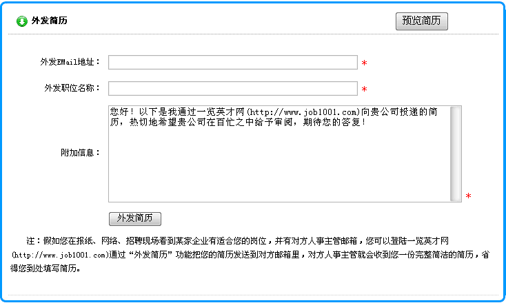 2) 在打開的頁面中,輸入接收企業(yè)的Email地址、應(yīng)聘的職位名稱以及您的其它要求后,點擊"發(fā)送簡歷"按鈕就可以了。如下圖所示: